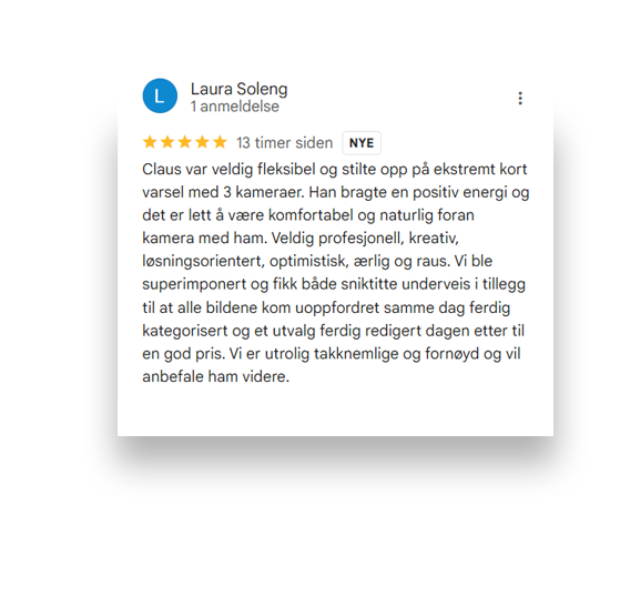 Jeg leverer bilder med driv, sjel og kvalitet – og prøver å unngå klisjéer. Jeg jobber for å få frem energien og følelsen, og skape situasjoner som ikke er statiske. For dere som ønsker bilder med energi og personlighet – ta kontakt. Jeg ser frem til å høre mer om dagen deres, og hvordan vi kan skape minner som virkelig skiller seg ut.